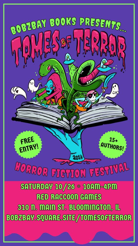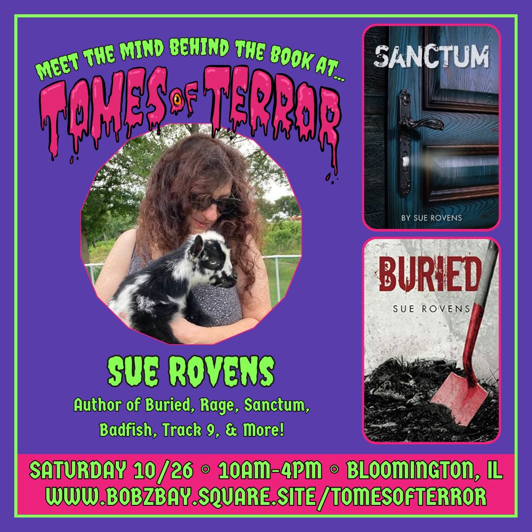 Can’t make it to Tomes of Terror and still want to meet Sue? She’ll be at the Mackinaw Holiday Cheer Market at the Mackinaw Winery on November 2nd and 3rd from 11 a.m. to 4 p.m. She’ll also be at the Bloomington Public Library Author Fair on November 9th from 1:30 p.m. to 3:30 p.m. and plans to be at the Normal West Bands Craft Show on November 23rd from 9 a.m. to 2 p.m. Sue would love to see you at any of these events, but if you can’t attend, you can follow her blog here or reach out to her via email at srovens@yahoo.com to chat or get merch and books!