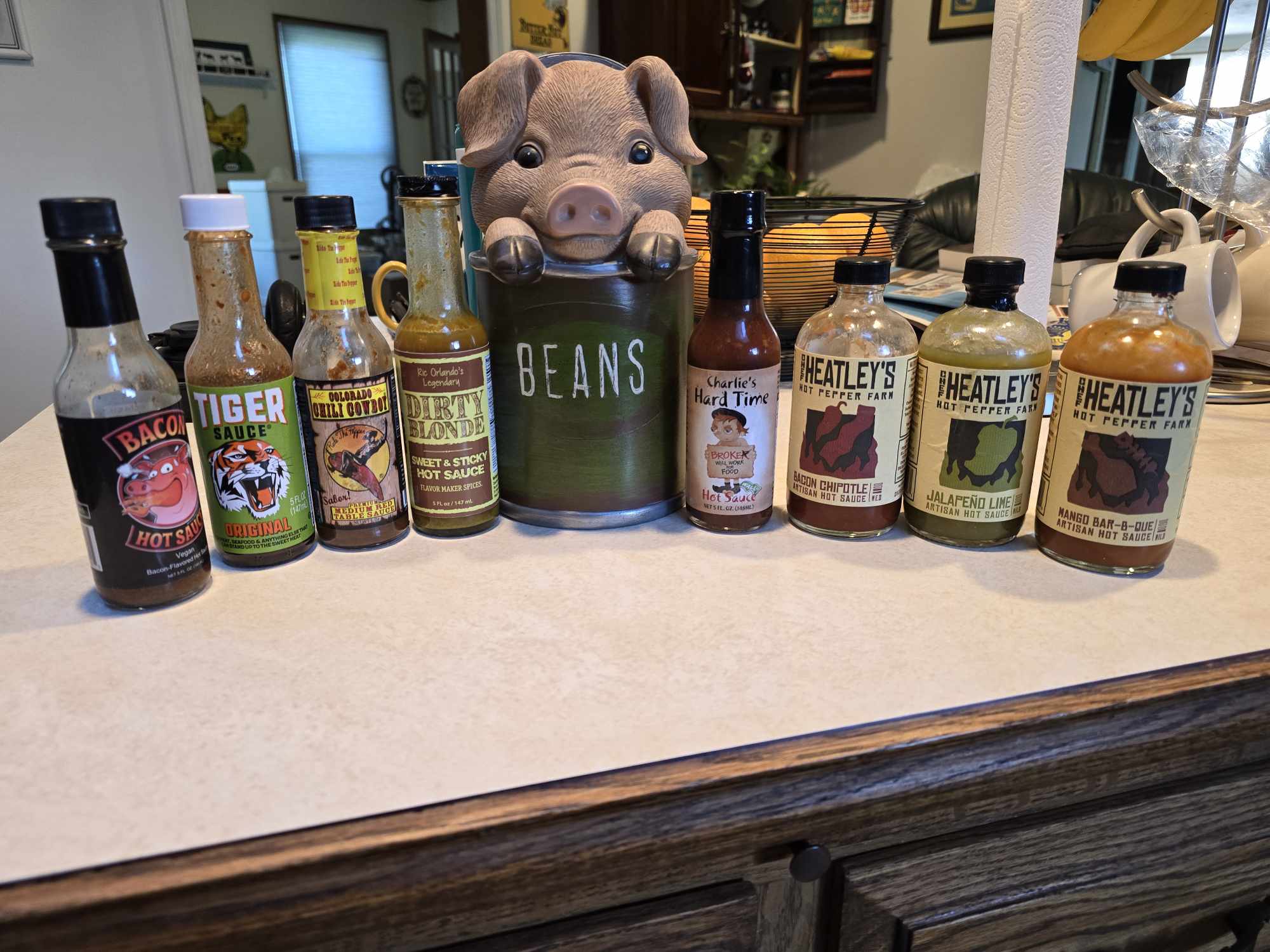 A: Charlie’s hot sauce collection.